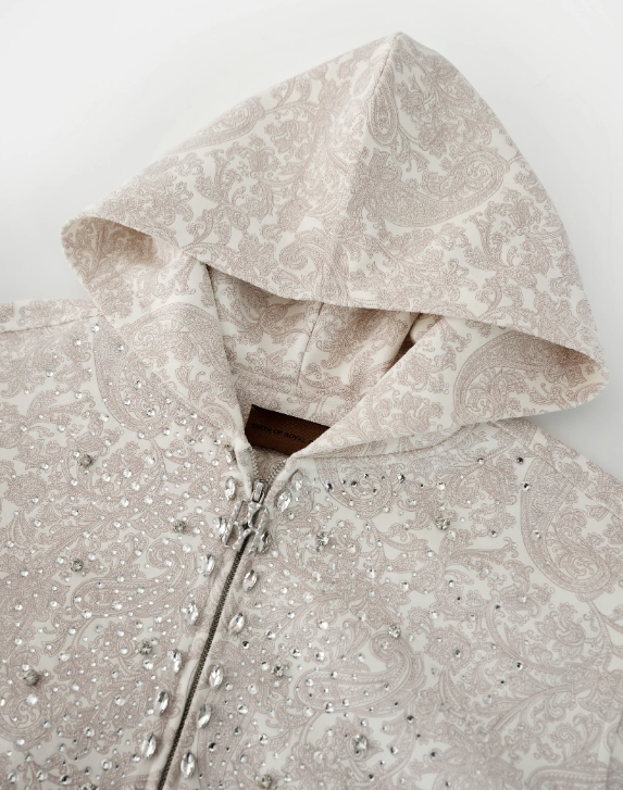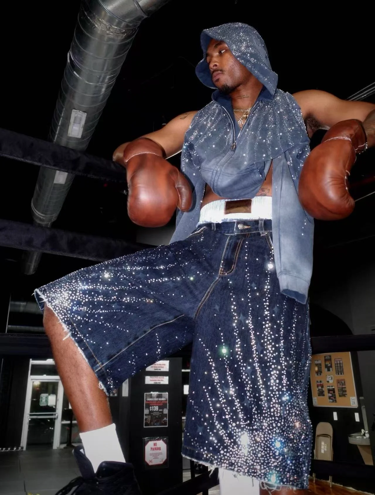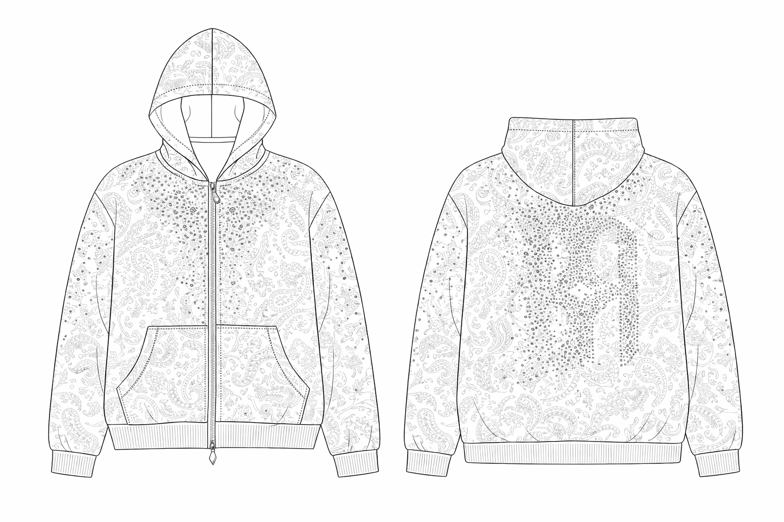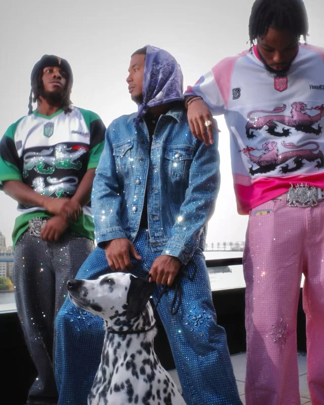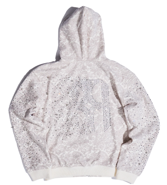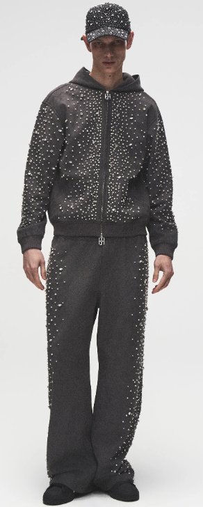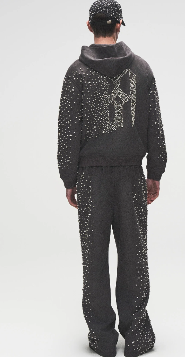 Signature Embellishments: The collection is anchored by the extensive use of high-quality Swarovski crystals, diamonds, and pearls. These are meticulously applied to everything from heavy-weight hoodies and denim to accessories like beanies and durags, creating a shimmering, multi-dimensional effect.