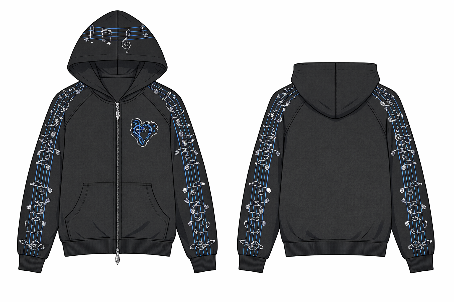 The collection thrives on the tension between the refined and the rugged. By fusing iconic musical motifs—like flowing staff lines and melodic notes—with high-impact embellishments, "ECHOS" creates a look that demands to be seen and heard.